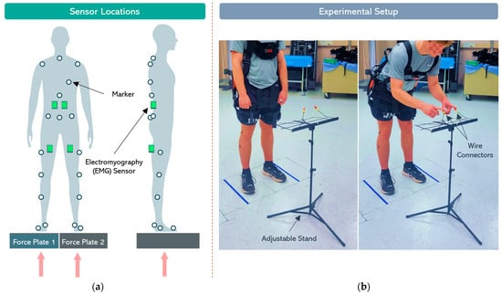 Measures of interest in this study included muscle demands in lower back and leg regions, trunk movement, and whole-body stability. Both lower back and leg regions were selected as participants in our pilot study reported prominent presence of fatigue in legs. Thus, the muscle groups of interest included the left/right erector spinae longissimus (LES/RES) and the left/right biceps femoris muscles (LBF/RBF). Both muscle groups are known to contract the most during trunk flexion as these muscle groups are responsible for pulling the weight of the upper torso and torso to ensure a stable posture. We implemented electromyography (EMG) to record muscle activity during the repetitive bending task using four sensors of the Trigno Wireless EMG system (Delsys, Natick, MA, USA, 1200 Hz). We followed the protocols provided by SENIAM [58] for placing the sensors on respective muscle groups using double-sided tapes. To segment the data into different portions as well as to detect trunk movement, an optoelectronic motion capture system (VICON, Hauppauge, NY, USA, 100 Hz) was used. This included 20 reflective markers placed on the upper body (three on the upper back, two on the middle back, and three on the hip) and lower body (three on each leg and three on each foot) of each participant (Figure 1). Marker placement locations were determined based on guidelines provided by VICON [59]. For determining impacts on balance, two force plates were used (AMTI, Advanced Mechanical Technology, Watertown, MA, USA), where participant stood upon floor-embedded force plates (AMTI OR6-6 platform, MA, USA, 1000 Hz). All three systems were time-synced using the VICON NEXUS system.
