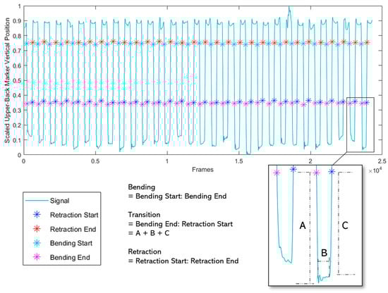 Schematic showing segmentation of each bending and retraction cycle from the upper back marker during 30 cycles of a repetitive trunk flexion task based on type of spatial activity categorized as bending, retraction, or transition movement.