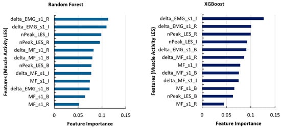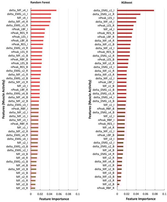 In the analysis of muscle activity (Figure 4), ‘delta’ parameters, representing changes in muscle activity over time, were identified as the most influential features for both RF and XGB algorithms. Specifically, the ‘delta_MF_s4_I’ feature, denoting the change in median frequency of the EMG sensor placed on the right leg, showed the highest importance for RF, while ‘delta_EMG_s1_I’, which denotes the change in amplitude of sensor on the left lower back, displayed highest importance with XGB. Notably, features from sensors placed on the left (Figure 5) and right erector spinae (Figure 6) exhibited distinct patterns of importance, with peak activity and ‘delta’ parameters demonstrating high relevance during specific phases of movement. When only the features from EMG sensor placed on the left lower back were considered, ‘delta_EMG_s1_R’ and ‘delta_EMG_s1_I’ features representing the change in amplitude during the retraction and transition portions of trunk flexion cycles were most prominent with both RF and XGB algorithms. On the other hand, considering the sensor on right lower back, ‘nPeak_RES_I’, which denotes the normalized peak amplitude during transition portion, displayed the highest importance for both the RF and XGB algorithms.