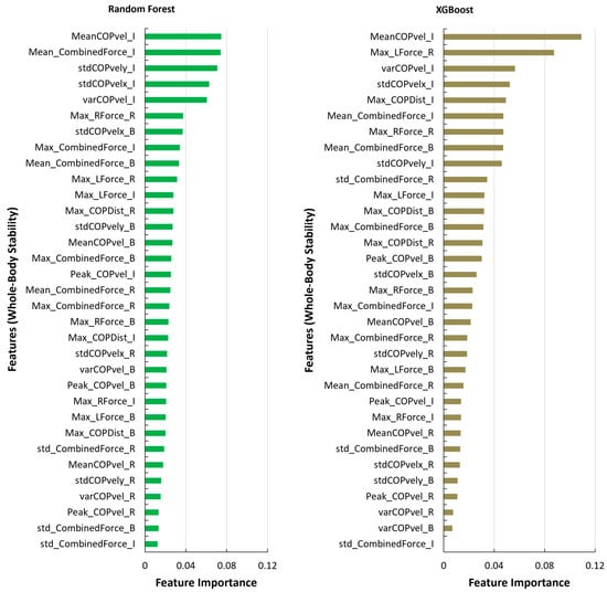Looking at the features obtained from whole-body stability (depicted in Figure 7), ‘MeanCOPvel_I’, which represented the mean velocity of the Center of Pressure (COP) during the transition phase emerged as the most significant feature for both RF (0.07) and XGB (>0.1). Similar to the measures of muscle activity and trunk movement, top features from the stability measures were also associated with the transition and retraction phases, emphasizing the importance of these phases in detecting fatigue.