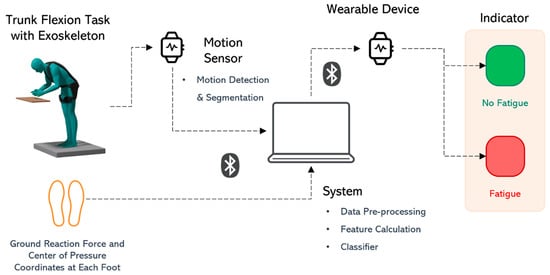 Outcomes from this study may be used to develop a portable wearable system, or even a module attachment for BSIEs to indicate fatigued states in their wearers. One example is shown in Figure 8, similar to previously proposed mobile monitoring devices [67,68]. Our study shows the success of force plate and single-sensor EMG systems for classifying fatigued states during trunk bending tasks assisted by a BSIE. Among these two sensor systems, EMG requires skin preparation, attachments/taping, and may not be optimal for continuous monitoring of workers. On the other hand, force plates can be embedded underneath the floor. While EMG-derived features may offer advantages in detecting muscle fatigue in specific muscle groups, force plate system can provide a comprehensive assessment of overall body movement, reflecting a global measure of fatigue. This shows potential opportunities to replace force-plates with insole pressure sensors that provide similar measures, specifically acceleration, plantar pressure, COP, and GRF at each foot [35,46]. Our study employed two force plates, each supporting one foot, potentially facilitating a seamless transition to a pressure insole system. This transition could pave the way for more accessible and minimally invasive fatigue detection among BSIE users.