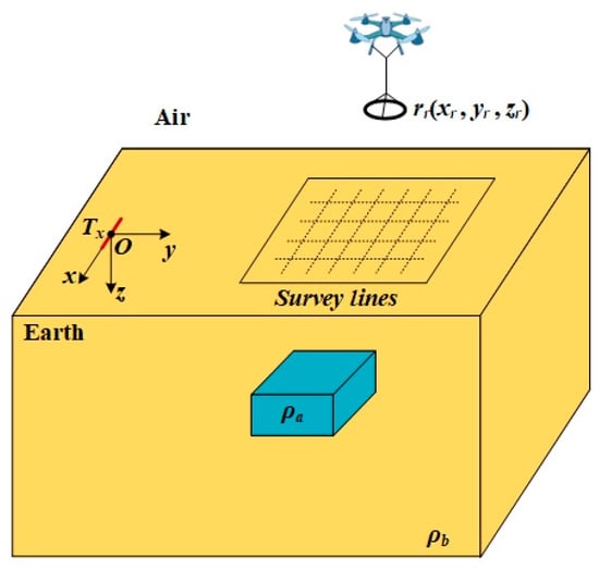The schematic diagram of GAFEM detection system is shown in Figure 1; the electric source is located in the origin along the x-axis, and the z-axis is positive downward, with the origin at the center of the electric source. The received magnetic sensor is in the air, lifted by an unmanned aerial vehicle, (xr, yr, zr) is the coordinate of the receiver point.