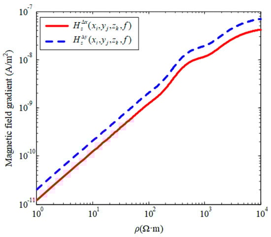 where ΔLx = |xi − xi−1| and ΔLy = |yj − yj−1| represents the distance between the two adjacent points in the x direction and y direction, respectively. Subscripts i, j, k represent the number of the receiver point coordinates in x, y, z direction, respectively. Equations (1)–(3) reveal that the primary influencing factors of the magnetic field gradient include the coordinates of the receiver point, transmitting frequency, and subsurface electric parameter ρ. To investigate the relationship between the magnetic field gradient and the resistivity, we calculate the magnetic field gradient for a changing resistivity of the homogeneous earth as an example, the receiver point and transmitting frequency are set as (3000, 5000, −30) m, f = 64 Hz, as shown in Figure 2.