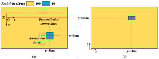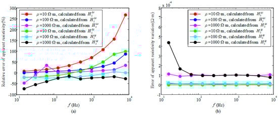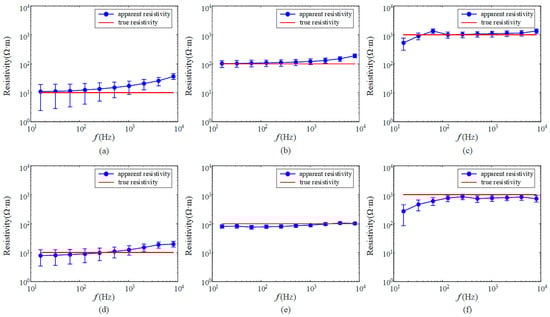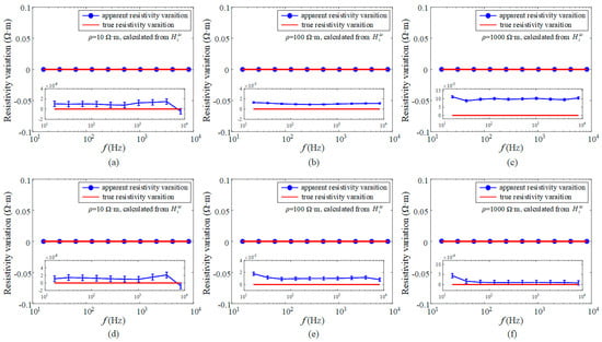 Figure 3a–c shows the calculated apparent resistivity from by Equation (2), Figure 3d–f shows the calculated apparent resistivity from by Equation (3). Globally, the calculated apparent resistivity distributes near the true model, but there are varying calculation errors for different models. Specifically, in Figure 3a,d, when the uniform earth resistivity is 10 Ω·m, the apparent resistivity in the high-frequency band significantly deviates from the true model, and when the frequency is 8192 Hz, the deviation reaches a maximum of 26 Ω·m. In Figure 3b,e, when the earth resistivity is 100 Ω·m, there exists a larger error in calculating apparent resistivity using the x-direction gradient in the high-frequency band, the deviation reaches a maximum of 87 Ω·m when f = 8192 Hz; while the y-direction gradient yields a larger error in the low-frequency band, the deviation reaches a maximum of 24 Ω·m when f = 64 Hz. In Figure 3c,f, when the earth resistivity is 1000 Ω·m, there is a distinct difference between the calculated apparent resistivity and real model in the low-frequency band, when the frequency is 16 Hz, the deviation reaches a maximum of 732 Ω·m. The irregular calculation errors of the uniform model may result in random artificial anomalies in apparent resistivity imaging of anomaly models. Therefore, this deviation cannot be ignored.
