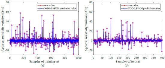 Figure 5 shows the prediction results of the NGO-LSSVM model. Figure 5a represents the partial prediction results of the training set, and Figure 5b is the prediction results of the test set. In both datasets, a strong consistency is observed between the predicted values and true values.
