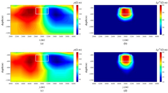 The imaging results for the model I: (a) the apparent resistivity calculated from magnetic field, (b) the apparent resistivity variation predicted from magnetic field gradient along the x-direction survey line, (c) the apparent resistivity calculated from magnetic field, (d) the apparent resistivity variation predicted from magnetic field gradient along the y-direction survey line. The white box indicates the outline of the conductive abnormal body.