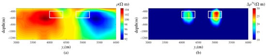 The imaging results for model II: (a) the apparent resistivity calculated from magnetic field, (b) the apparent resistivity variation predicted from magnetic field gradient . The white boxes indicate the outlines of the conductive abnormal bodies.