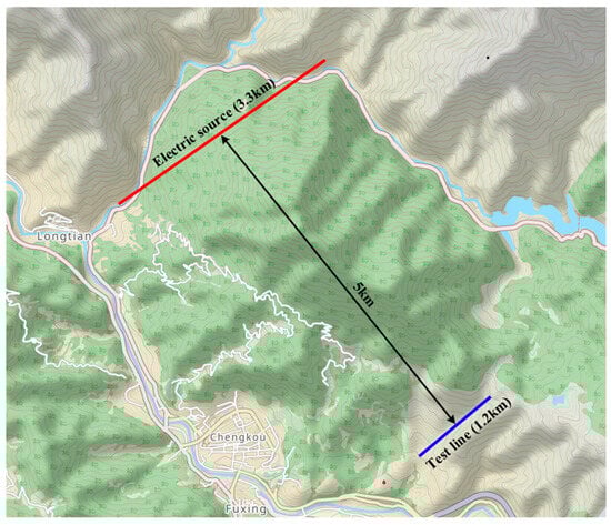 In the Chengkou area, the Chengba fault zone exhibits a generally undulating plane, with the fault plane predominantly oriented due north, dipping at an angle between 40° and 80°. The layout of the electric source and test line are designed as shown in Figure 14. In the test, the transmitter equipment is the ground-airborne electromagnetic transmission system developed by Jilin University with a maximum transmitting power of 200 kW. The received part used an unmanned aerial vehicle to load the lightweight receiver system. The flight speed is about 6 m/s and, during the apparent resistivity imaging, we acquire a point every 2 s, so the station spacing is around 12 m, then we obtain data with a lateral resolution of 12 m after data processing. The margin of error in data interpretation does not exceed 5%.