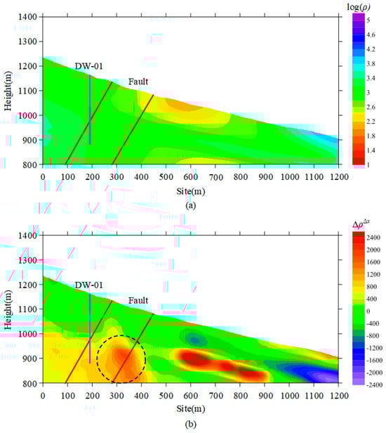 The proposed NGO-LSSVM algorithm is used to interpret the measured data. According to the previous analysis, the variation in apparent resistivity of the conductive anomaly body is positive, indicating that as the resistivity decreases, the variation in apparent resistivity will reach a positive maximum value. The resistivity, however, exhibits a decrease in the presence of low resistance anomalies. Therefore, its trend of resistivity variation should be opposite to that of the resistivity. To compare the results of the apparent resistivity calculated from magnetic field and the apparent resistivity variation predicted from magnetic field gradient, Figure 15a shows the calculated apparent resistivity results, and Figure 15b is the predicted apparent resistivity variation results. The red lines indicate the inferred location of the Chengba fault zone, and the magenta line indicates the drill hole. In Figure 15a, the indication of the fault location is not clear enough in the apparent resistivity imaging section, so further analysis of the apparent resistivity-height curves at the sites is needed to identify the fault definitively [36]. However, in Figure 15b, the apparent resistivity variation imaging section reveals a distinct conductive area at the location of the fault, as depicted by the black dotted line, thereby enhancing the indication ability of the imaging sections. In addition, there is a suspected low-resistance region on the right side of the fault zone. To provide a clearer depiction of the distribution of apparent resistivity variation and facilitate a comparative analysis with the measuring of resistivity in the geological drilling method, Figure 16 illustrates the contrasting curves between the measured resistivity and predicted apparent resistivity variation at drill hole DW-01.