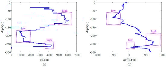 Comparison between apparent resistivity and apparent resistivity variation. (a) Apparent resistivity-depth section calculated from magnetic field Hz, (b) apparent resistivity variation-depth section predicted from magnetic field gradient .