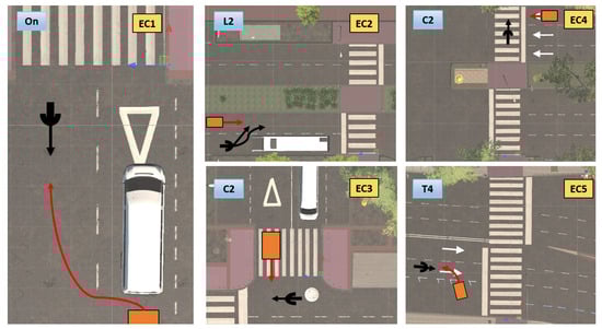 The typology of urban scenarios chosen to be modelled in the VR application corresponds to the categories established in the report by TNO in the City Alternative Transport System (CATS) project [32] of the analysis of vehicle–cyclist accident scenarios in the EU [33]. Since categories C and L account for 63% of seriously injured and 78% of fatal collisions between vehicles and cyclists, both categories are included in the modeling. The On-coming category, which is the fourth most relevant category, and the T4 category are also included.
