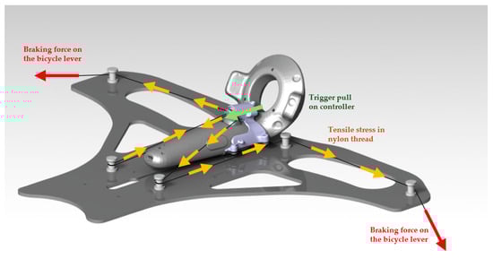 The controller trigger actuator is attached to a designed and 3D-printed casing by a spring-returning mechanism, which physically pushes the desired controller button when a high-tensile strength nylon thread is tensioned during the braking phase. The levers are connected to the trigger through this thread, which makes it possible to synchronize manual braking on the handlebars with that of the virtual bicycle, regardless of which lever is being pushed.
