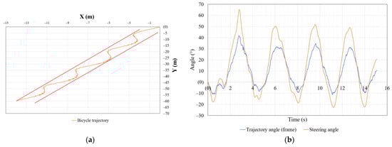 Bicycle trajectory in the calibration test (a), and values of handlebar angle and bicycle frame angle as a function of time (b).