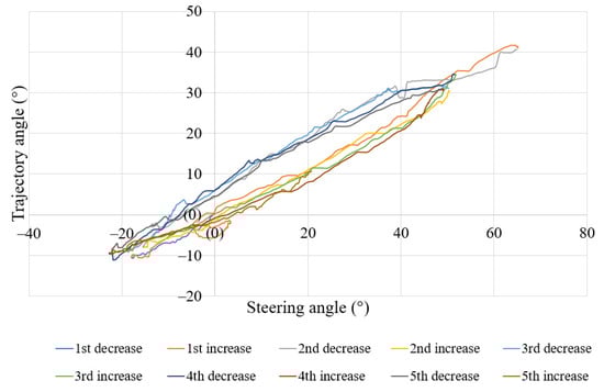 Trajectory angle vs. steering angle plot for the different increases and decreases in the oscillatory signals.