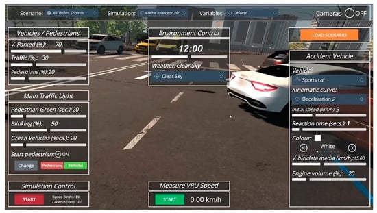 Furthermore, in order to carry out more extensive studies on the VRUs’ behavior in potential collision situations, an application for the automatic generation of urban scenarios is being developed. The interface allows the research team to configure the number of lanes and the direction of vehicle traffic, and to select a wide range of infrastructure elements and their location, traffic signs, the vehicle-VRU interaction type, and whether or not there is traffic light regulation.