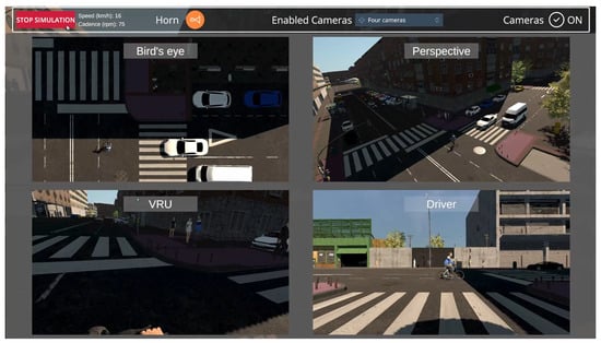 In each of them, the research team monitors the simulation through four cameras (bird’s eye or zenithal, in perspective, and from the point of view of the cyclist and the driver) (Figure 10).