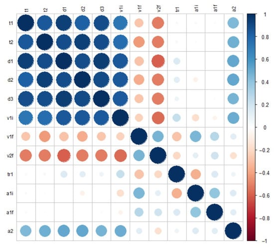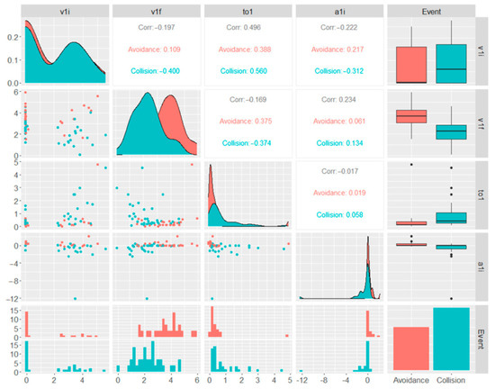 The accelerations “a1i” and “v1f” reap the highest importance values among the numerical predictors, which coincides both with the association rules derived from the interpretation of the scatterplots in Figure 8, and with the splitting criterion for the individual DT and the example tree of the RF model.