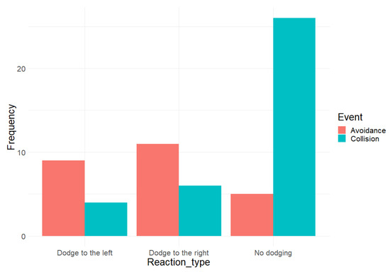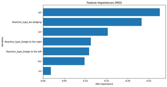 Figure 18 shows the value of the importances according to the MDI criterion for the explanatory variables introduced in the model. The impurity-based calculation of significance usually favors numerical predictors and categorical predictors with high cardinality, which is why the variable “Reaction_type” obtains a significantly high significance value. It is also shown how the absence of dodging is the most important category in impurity reduction and class separation.