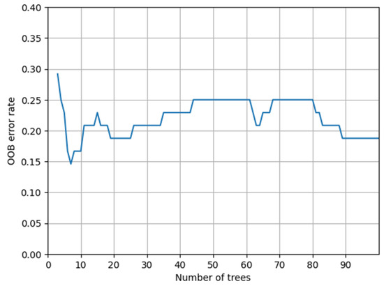 Likewise, the RF model performance was optimized when no maximum depth was set, the minimum number of observations to split an internal node was 10, and the minimum number of observations in a node was four (Figure 17).