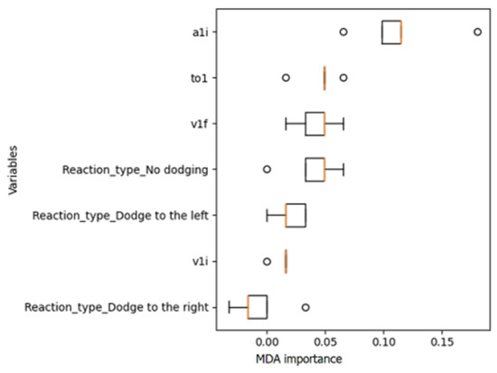 On the other hand, Figure 19 shows the importances calculated through the permutation criterion. The feature “Reaction_type” contributes the least to the RF accuracy, although only one of the categories (“Not_dodging”) is less affected by permutation. The kinematic variables become more important, with “a1i” being the variable with the highest importance. The negative importance value of the category “Dodge to the right” indicates that the model relies less on the information provided by this coded variable when making predictions, suggesting that it may introduce redundant information to the classifier.