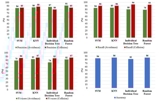 For observations labelled as “Collision”, a higher accuracy of the model implies that it predicts fewer cases of collision, as it identifies them as avoidance. If recall is higher for this category, then it predicts more collision cases in those situations where the accident does not occur. The same comparison applies to the “Avoidance” class, where higher precision predicts more crash cases and higher recall predicts more avoidance cases.