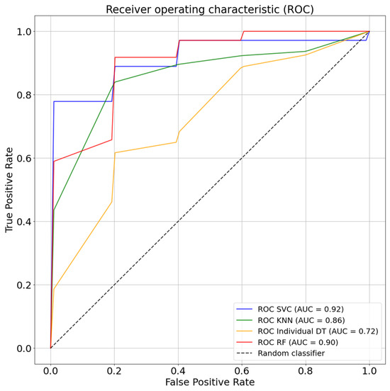 The ROC (receiving operating characteristic) curves show a trade-off between the true positive rate (sensitivity) and the false positive rate (1-specificity). (Figure 22). SVC exhibits a higher AUC (area under the curve) value, although the distribution of points on the curve of this classifier is quite similar to those corresponding to the RF and KNN models for high values of the discrimination threshold. The individual DT is the classifier with the lowest AUC value, since it is the one that is the furthest away from the perfect classification point and closest to the non-discrimination line.