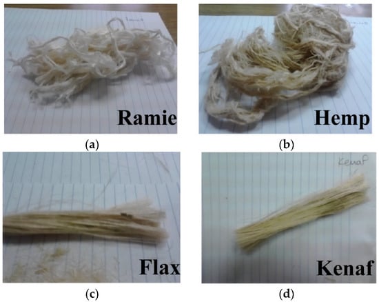 Bast fibers—fibers collected from the stem of the plant—used in the present study are from hemp, kenaf, ramie, and flax. In the literature, their physical and mechanical properties dramatically vary over a large range of values, since inherent variability, as well as the factors mentioned above, lead to an enormous heterogeneity of reported values. Table 1 presents an overview of some of the characteristics of the fibers studied according to a series of studies. These fibers differ in terms of their structure, the number of main building blocks, the content of cellulose and other constituents, water content, etc.
