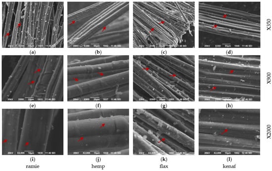 SEM microphotographs of fibers at different magnifications: (a) ramie ×350; (e) ramie ×900; (i) ramie ×2000; (b) hemp ×350; (f) hemp ×900; (j) hemp ×2000; (c) flax ×350; (g) flax ×900; (k) flax ×2000; (d) kenaf ×350; (h) kenaf ×900; and (l) kenaf ×2000. Red arrows highlight specific areas of interest in terms of the fibers’ sizes, shapes, surface roughness, and surface-lump materials.