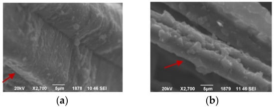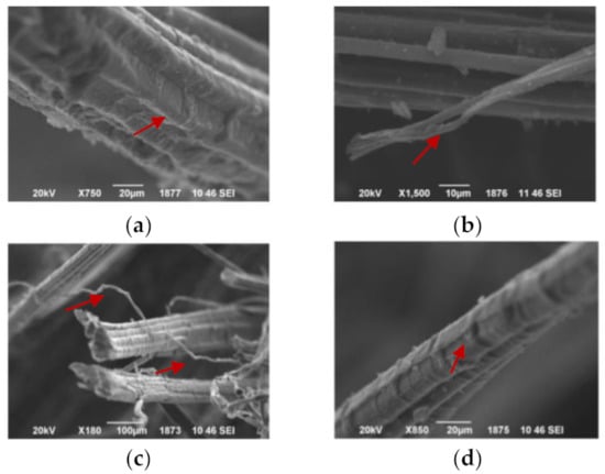 SEM is an excellent technique for performing a macroscopic analysis of a fiber’s morphology by examining the fiber’s size and shape, the degree of its surface roughness, and the existence of any surface-lump materials (e.g., wax or other impurities []).