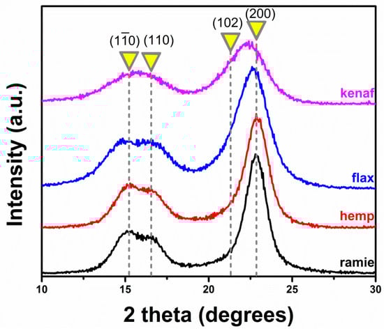 The X-ray-diffractometry profiles of the studied natural fibers are shown in Figure 5. A series of peaks is observed, which are displayed in Table 4, with their intensities and their widths varying, as shown in Figure 5. The main contributors to the observable diffraction pattern are three peaks with (10), (110), and (200) Miller indices, with the first two peaks being overlapped. Those peaks are observed from the lowest angle in the aforementioned order. Furthermore, the contribution of the diffraction peak with a (102) Miller reflection is obvious, although seen as a shoulder due to extensive overlapping with the (200) diffraction peak. The (102) diffraction peak, which is scarcely reported, is detected on randomly oriented powder samples of Iβ cellulose [].