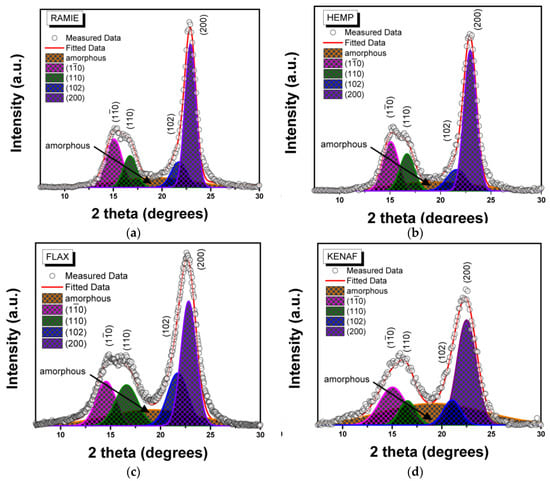 There are various methods which may be implemented for the calculation of cellulose crystallinity. The Segal peak height method [] is the most common method, though it has been proved to poorly achieve a reliable calculation of crystalline contribution, leading to great errors [,]. According to Terinte et al. [], the peak-fitting method is consistent enough. Consequently, peak deconvolution was used for the thorough examination of natural fibers’ diffraction bands and the establishment of both the crystalline and amorphous phases. The diffractograms are shown in Figure 6, and they are deconvoluted with Gaussian-profiled peaks, while a wide Gaussian peak is set between the cellulose (200) diffraction peak and the (10) and (110) diffraction peaks, assigned to the amorphous contribution [].