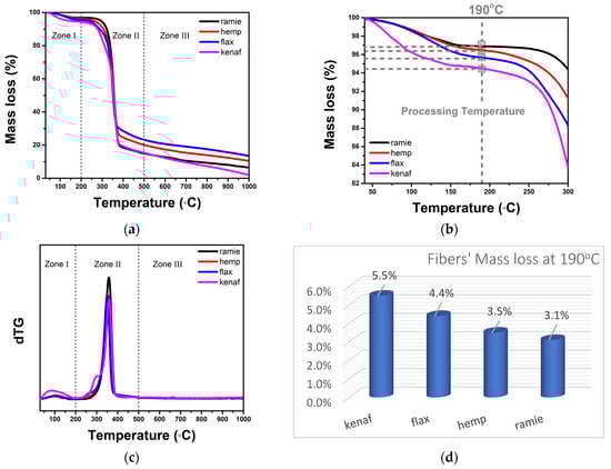 In Figure 7d, the fibers’ mass loss at the processing temperature is presented, where it can be clearly seen that at 190 °C ramie had lost 3.1% of its initial mass, hemp had lost 3.5% of its mass, flax had lost 4.4%, and kenaf displays the greatest mass loss, which is of 5.5%.