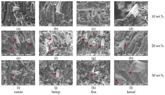 SEM microphotographs of the composites’ fractured surfaces: (a,e,i) for ramie; (b,f,j) for hemp; (c,g,k) for flax; and (d,h,l) for kenaf, filled with filler content of 10 wt.%, 20 wt.%, and 30 wt.%, respectively.