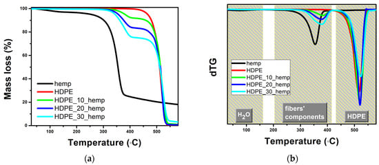 The thermal stability of lignocellulosic-based polymer composites is crucial; since it helps in predicting the durability and performance of the composite material under certain temperature conditions, it guides the selection of appropriate manufacturing processes and it helps in determining the composites’ appropriateness for certain applications. Figure 9 presents the TGA (Figure 9a) and dTG curves (Figure 9b) of HDPE and its hemp-based polymer composites. A gradual shift of curves toward lower temperatures upon fiber-content increase is obvious, and is associated with the fact that incorporated fibers have a distinct contribution to TGA profiles, since they thermally degrade at lower temperatures when compared to HDPE.