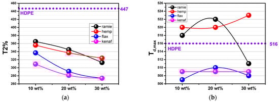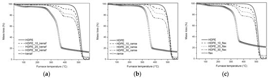 The processing temperature of the present study’s HDPE_xx_fiber composites must be noticeably well above the melting temperature of HDPE at 134 °C, as already stated, but also low enough to avoid any thermal degradation to the fibers, which may lead to negative effects on the major properties of the composites []; this is why composite preparation was performed at 190 °C. In Figure 7b, apart from the mass loss of all the fibers at low temperatures—which correlates to moisture content—the TGA curves of all the studied fibers at the processing temperature of composites are also displayed, where it is more than evident that the fibers’ behavior differs radically. It is obvious that at 190 °C, the fiber with the least thermal degradation is ramie, while the fiber with the greatest thermal impact is kenaf, having lost almost 5.5% of its initial mass.