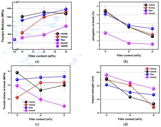 In general, HDPE has a ductile behavior, and since it is reinforced with lignocellulosic fibers that exhibit a brittle behavior, the respective composites are also brittle []. The impact strength of the composites is a measure of the composites’ toughness, with the main factors controlling this property being the matrix and fiber properties, as well as matrix–fiber interface []. When specimens are subjected to a force, they absorb the energy of the impact, and that energy is dissipated by certain mechanisms, which include fracture, delamination, and fiber pull-outs []. The main failure mechanism in the studied composites is fiber pull-outs, since there is not significant interfacial adhesion between the fibers and the matrix. So, as seen in Figure 12d, the introduction of different kinds of fibers in HDPE leads to a gradual decrease in the impact strength, which is in all cases significantly lower than that of neat HDPE. This may be due to the interfaces that act as stress-gathering points, from where cracks may initiate and propagate, and upon increasing filler content, the number of interfaces becomes high, progressively lowering the composites’ overall impact strength.