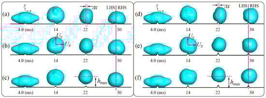 Figure 3b). Upon droplet recontact with the surface, significant differences in droplet volume between the right-hand side (RHS) and left-hand side (LHS) are observed at 30 ms.