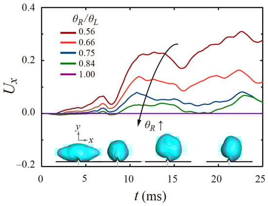 Ux) of the merged droplets over time. For analysis, specific droplet shapes at certain time intervals are included below the graph. Consequently, increased wettability asymmetry induces significant changes in