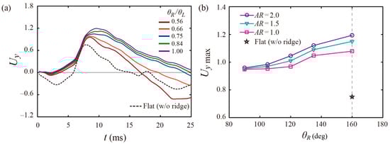 Uy starts decreasing around 10–15 ms, when the droplet detaches from the ridge surface. The rate of decrease in