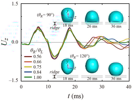 Uy relatively diminishes. After approximately 15 ms, the droplet recontacts the ridge, and the velocity approaches zero.
