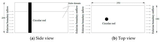 The calculation parameters of the hypothetical model [32] used in the current study are as follows. The circular rod diameter was 0.02 m and the length of the part of the rod submerged in the water body was 0.14 m. The water body was simulated using Eulerian elements, with a density of 1000 kg/m3, a viscosity of 0.001 Pa·s, and a speed of sound of 1480 m/s2. The upper surface of the water body was a free boundary, and the initial inflow velocity was set for the fluid. An Euler inflow boundary was applied on one side and an Euler outflow boundary on the other side. The inflow boundary had an initial velocity of Vx, while the outflow boundary allowed the material to flow freely (Figure 1). A smooth boundary was used at the bottom and on both sides, where Vz (the velocity in the z direction) and Vy (the velocity in the y direction) were set to zero. The contact between the cylinder and the fluid was defined as a smooth hard contact, where no mutual intrusion was allowed in the normal direction and the tangential friction was zero.