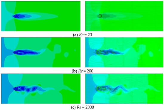 The circular cylinder flow problem is an obtuse-body winding problem and thus exhibits the unique phenomenon of vortex shedding into its wake. This phenomenon was first formally proposed by von Karman in 1912, and forms a vortex array known as the “Karman vortex street”. Numerous researchers, including Roshko [29], Taneda [30], and Zhu [20], have studied this phenomenon experimentally, and Zhu [20] found that it is related to the Reynolds number, which is defined in Equation (4) as follows: