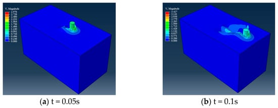 Figure 3 illustrates the velocity field clouds of the circular rod at different stages during its motion through the fluid. The results demonstrate that when the circular rod moved through the fluid at a certain speed, the velocity fields of both the rod and its surrounding fluid underwent significant changes. During the motion, a bulge formed in front of the circular rod, which led to the separation of the boundary layer at the maximum point of the column section width. This resulted in the formation of a free shear layer that extended to the back of both sides of the column. Within this shear layer, the outer part had a lower flow rate than the inner part, leading to a rotational tendency in the fluid and the formation of a vortex.