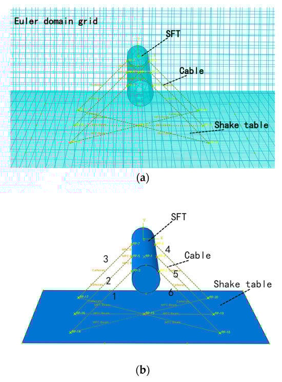 Using the CEL method, a numerical simulation analysis was conducted based on the aforementioned model test. The SFT tube body was set as a rigid body and was simulated using Lagrangian solid elements. The water body was simulated using Eulerian elements, with a density of 1000 kg/m3, a viscosity of 0.001 Pa·s, and a speed of sound of 1480 m/s. The ground containing the shaking table was simulated using rigid shell elements, and the anchor cable system was simulated using simplified spring elements. The anchor cable and the shaking table surface were hinged, as was the submerged floating tunnel section. To simulate the relaxation of the anchor cable, bilinear stiffness was introduced.
