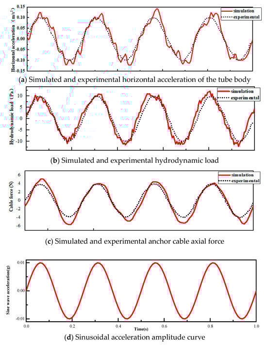 The numerical simulation was conducted in two steps, the first being a static equilibrium calculation, and the second being a dynamic seismic response calculation. In the latter, a sinusoidal seismic wave was applied horizontally to the bottom of the model, and a seismic time course analysis was conducted. Figure 7 shows comparisons of the time curve of the horizontal acceleration at the center of the SFT body, the horizontal hydrodynamic load–time curve on the outer surface of the tube body, and the time curve of the axial force of the anchor cable, with the experimental results reported by Sun and Chen [17,18]. The hydrodynamic load on the outer surface of the tube body mainly comprised frictional resistance and differential pressure resistance. The former represented the frictional force generated by the water body tangentially on the surface of the tube body and was a direct manifestation of the viscosity of the water body. The latter was an indirect manifestation of the viscosity of the water body, and it was largely caused by the reciprocal vibration of the tube body in the horizontal direction, which led to the water body alternately horizontally separating to the left and right of the surface of the tube body, thus producing pressure differences in the horizontal direction. The calculation results showed that the hydrodynamic load in the vertical direction at this time was much smaller than that in the horizontal direction, and was therefore not chosen as the hydrodynamic load in the vertical direction.