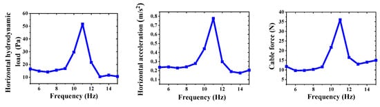 It is evident from the figure that, when the seismic wave frequency was 11 Hz, the horizontal hydrodynamic load, horizontal acceleration, and cable force of the tube body reached their maximum values (51.7 Pa, 0.777 m/s2, and 36 N, respectively). This indicates that the horizontal self-oscillation frequency of the SFT model was approximately 11 Hz. According to the corresponding similarity constant, this implies that the horizontal self-oscillation frequency of the prototype of the tunnel model was approximately 1.5 Hz.