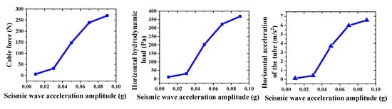 Next, the seismic response of the SFT under the same horizontal sinusoidal seismic wave, with a frequency of 4 Hz and a vibration time of 1 s, was investigated. The acceleration amplitude was adjusted to 0.03× g, 0.05× g, 0.07× g, and 0.09× g, and the peak horizontal hydrodynamic load, horizontal acceleration, and cable force were recorded and analyzed. The results are presented in Figure 9. We provide the tension time history curves of the cable under various conditions in Supplementary Materials Figures S8 and S9, further illustrating the dynamic changes in the tension.