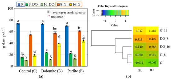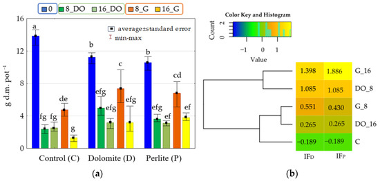 Root yield (Yr) of Zea mays (a) and the influence index of dolomite (IFD) and perlite (IFP) on Yr (b). Explanations of abbreviations are provided in Figure 1. The same letters on the bar graph (a–g) denote homogeneous groups, p < 0.050, N for each error bar = 4.