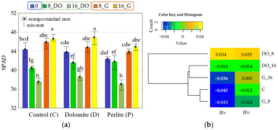 Greenness index (SPAD) of Zea mays (a) and the influence index of dolomite (IFD) and perlite (IFP) on SPAD (b). Explanations of abbreviations are provided in Figure 1. The same letters on the bar graph (a–h) denote homogeneous groups, p < 0.050, N for each error bar = 4.