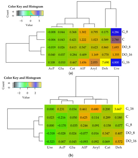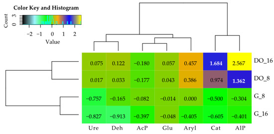 Diesel oil acted as a stimulator of dehydrogenases, catalase, alkaline phosphatase, β-glucosidase, and arylsulfatase, while inhibiting acid phosphatase. Conversely, gasoline served as an inhibitor for all enzymes. Therefore, the influence factors of DO (IFDO) on the activity of individual enzymes, except for acid phosphatase, were positive, whereas those of G (IFG) were negative (Figure 4). Generally, higher positive or negative values of these indices were induced by the implementation of both tested products at a dose of 16 cm3 compared to 8 cm3 kg−1 of soil.
